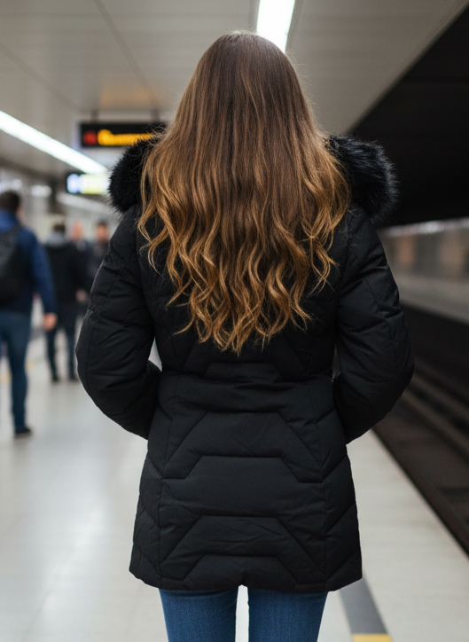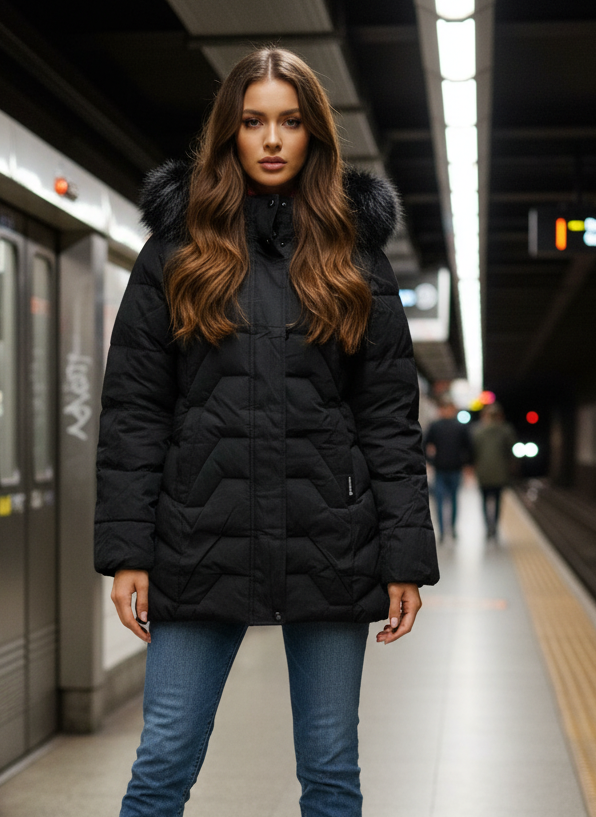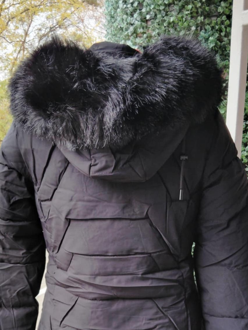 Fekete női télikabát – levehető kapucnival és prémmel(M-3XL)