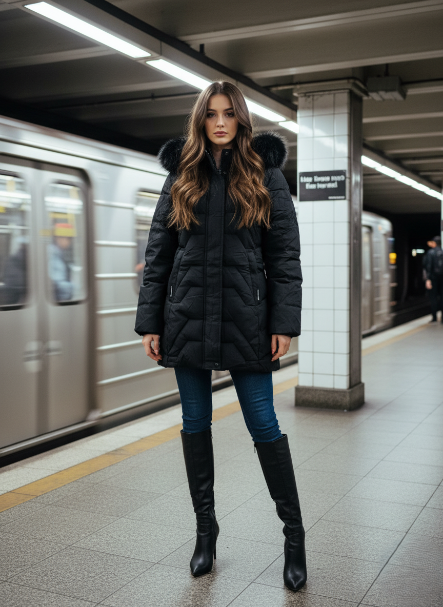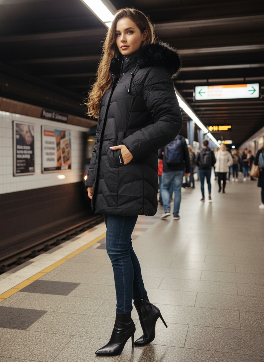 Elegáns, meleg és praktikus télikabát, amely tökéletes választás a hideg napokra. A kapucni és a gyönyörű, sűrű műszőrme levehető, így kétféleképpen is hordhatod – sportosabban vagy nőiesebben. Kényelmes fazon, puha bélés, mindennapi viseletre ideális.
