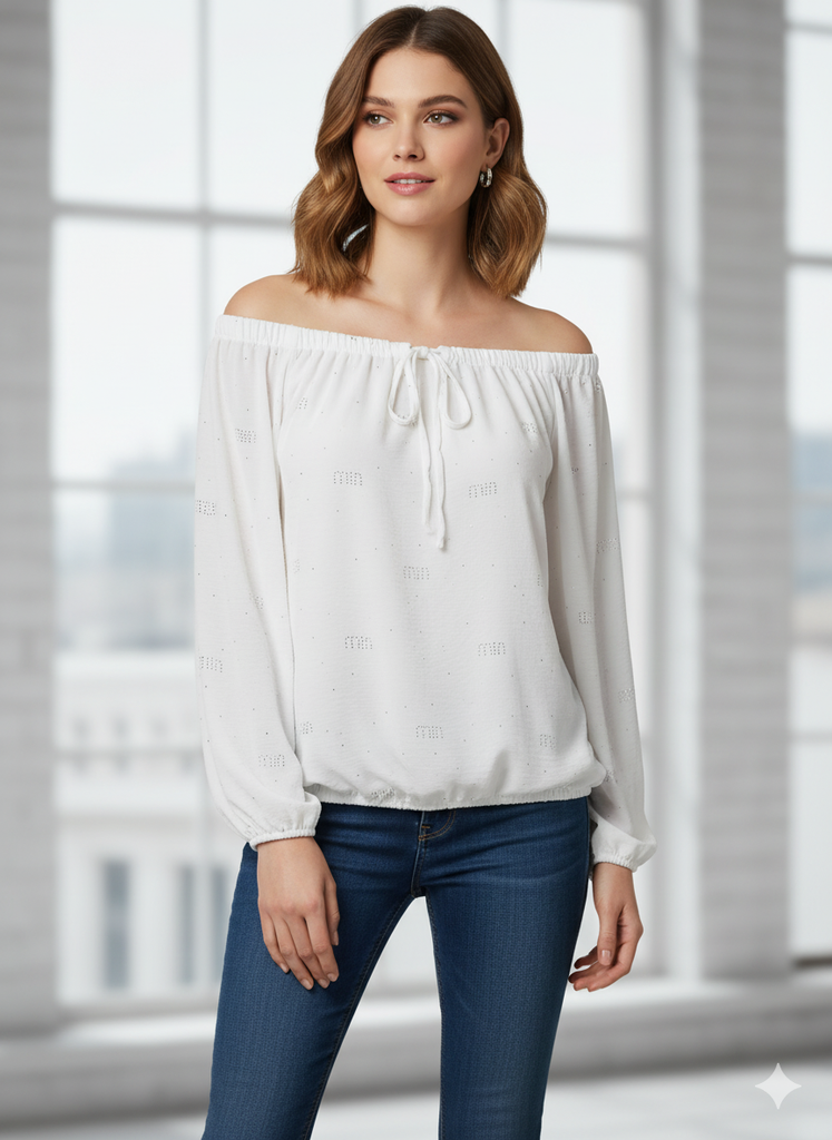 Női blúz – gumis vállrésszel, strasszkő díszítéssel (S-XXL)