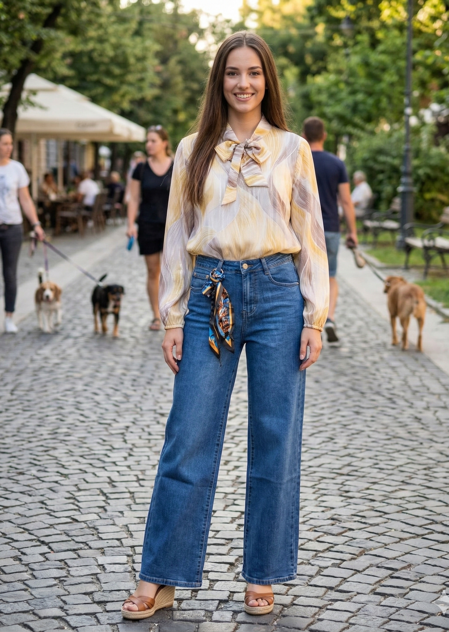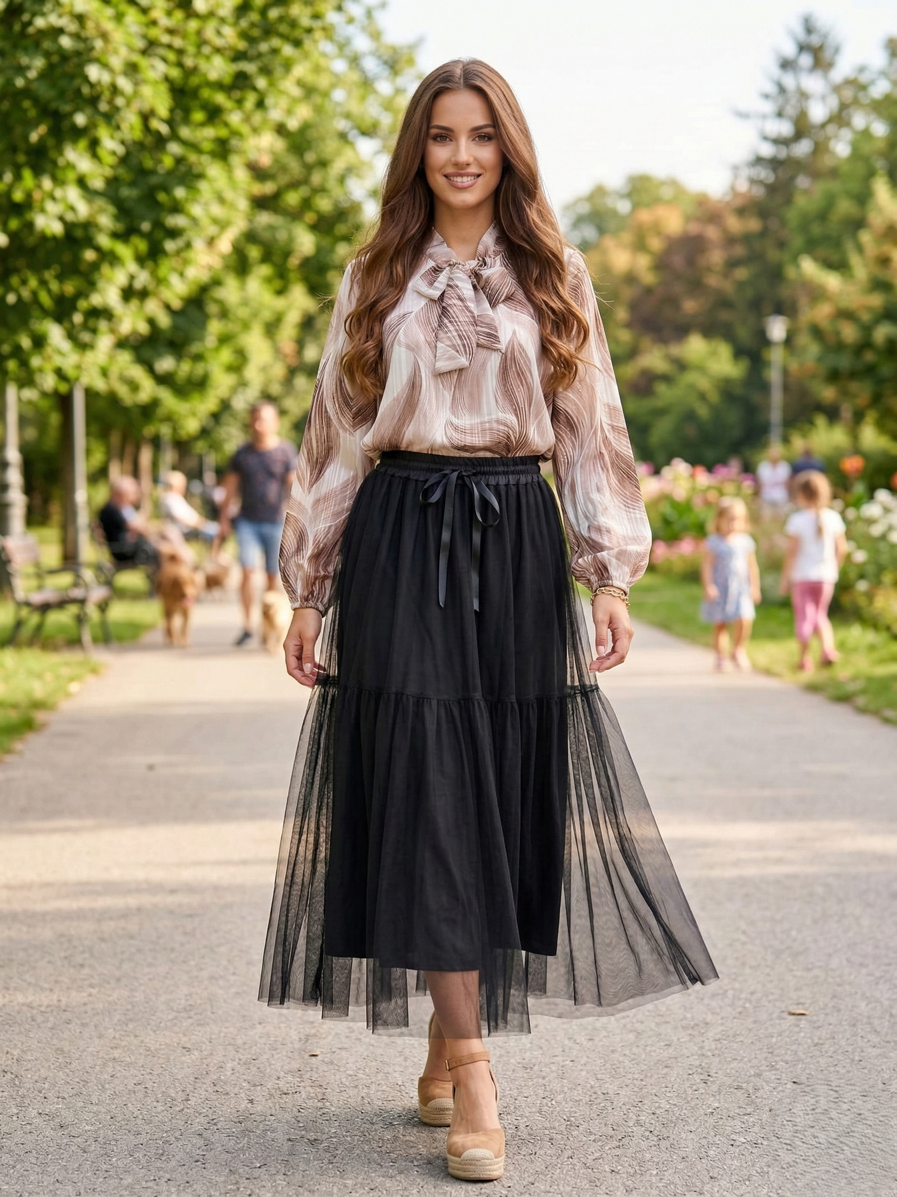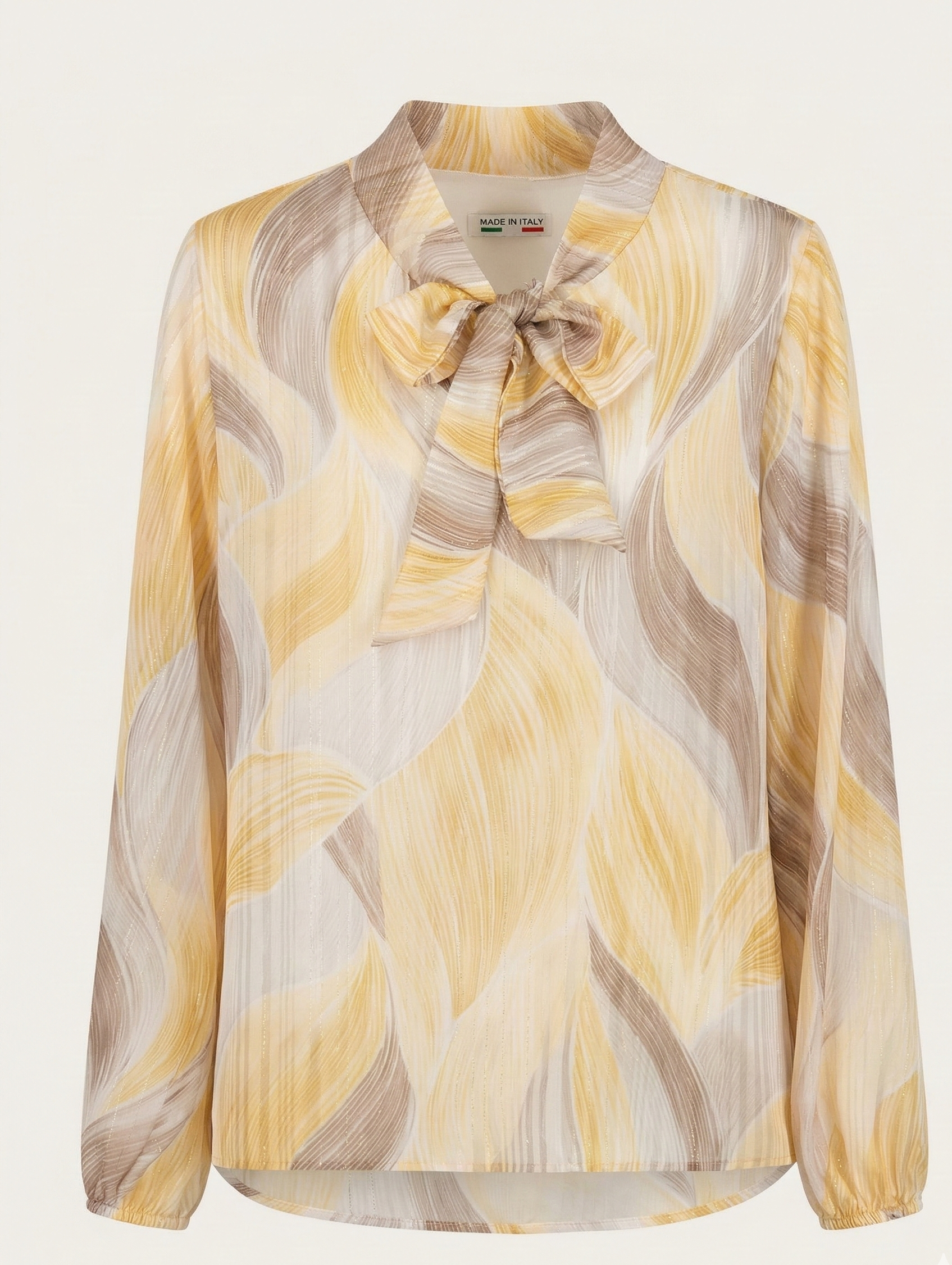 Nőies, könnyed esésű muszlin blúz, amely finom mintájával és elegánsan csillogó ezüstszálaival különleges megjelenést ad a mindennapi és alkalmi szetteknek is. A nyaknál megköthető szalag romantikus részlet, amelyet masnira kötve vagy lazán hagyva is viselhetsz.