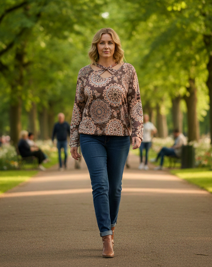 Vidd bele a mindennapjaidba a bohém eleganciát ezzel a különleges, mandala mintás felsővel! A barna és türkiz színek harmonikus találkozása, valamint az egyedi szabásvonal garantálja, hogy minden szem rád szegeződik majd.