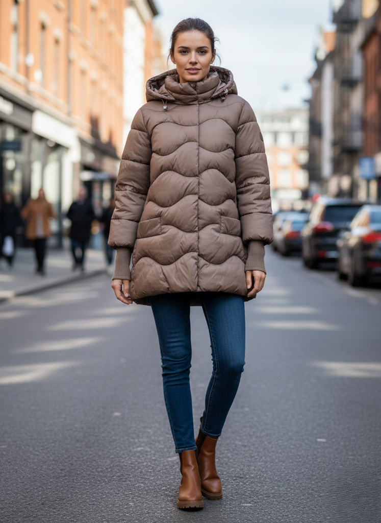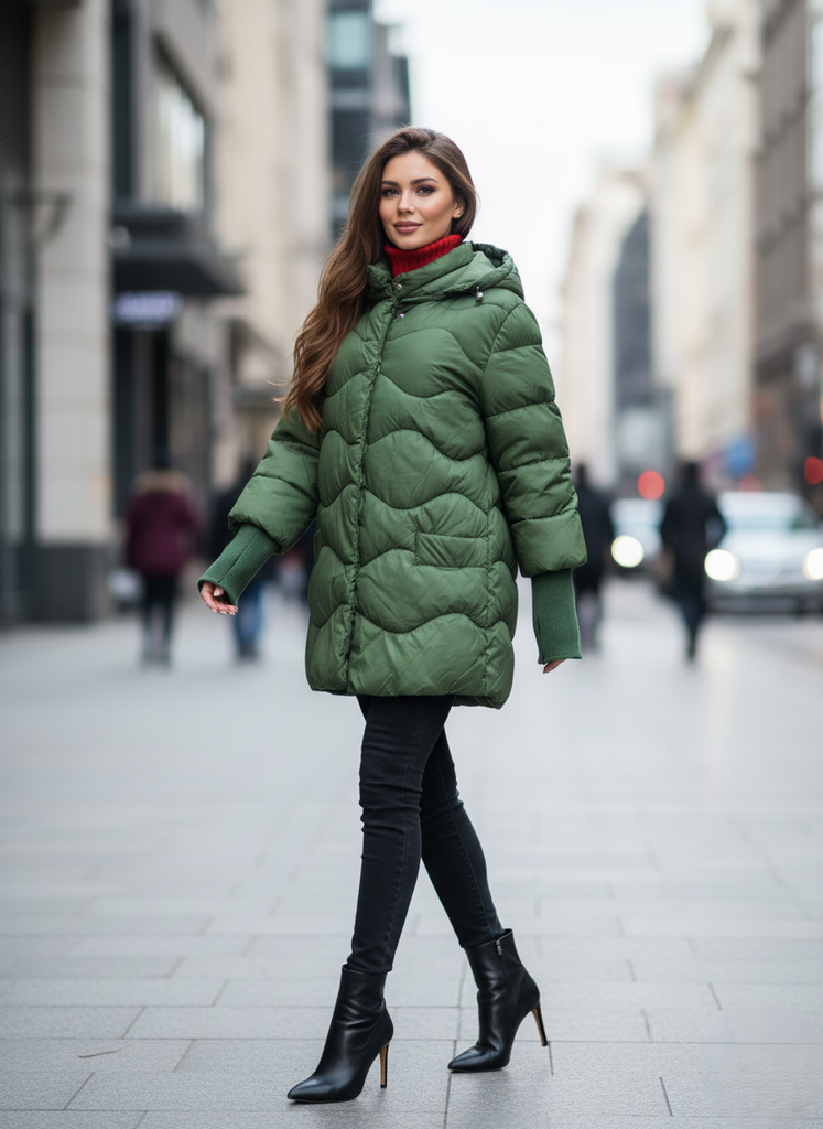 Női hosszú télikabát – kapucnis, modern steppelt (S-XXL)
