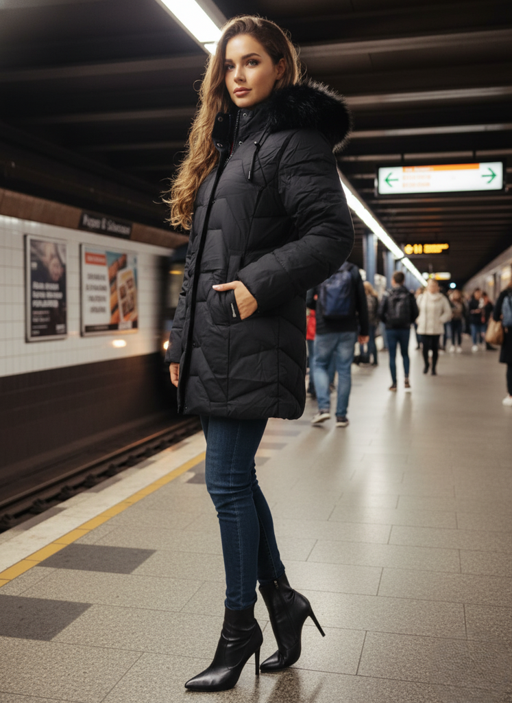 Fekete női télikabát – levehető kapucnival és prémmel(M-3XL)