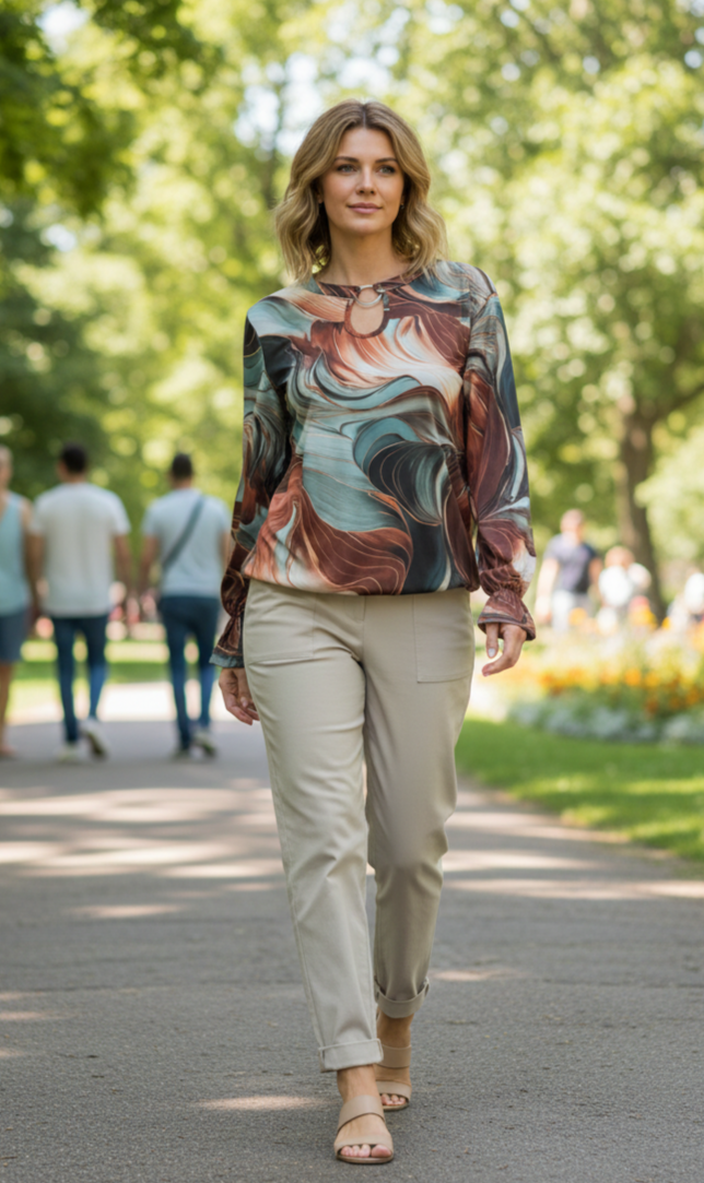 Frissítsd fel ruhatáradat ezzel a különleges, vibráló mintás felsővel! A lágy esésű anyag és a gumírozott alj tökéletes homokóra sziluettet kölcsönöz, miközben kényelmes viseletet biztosít egész napra. A dekoltázsnál található ezüst színű karika modern és elegáns hangsúlyt ad a megjelenésnek.