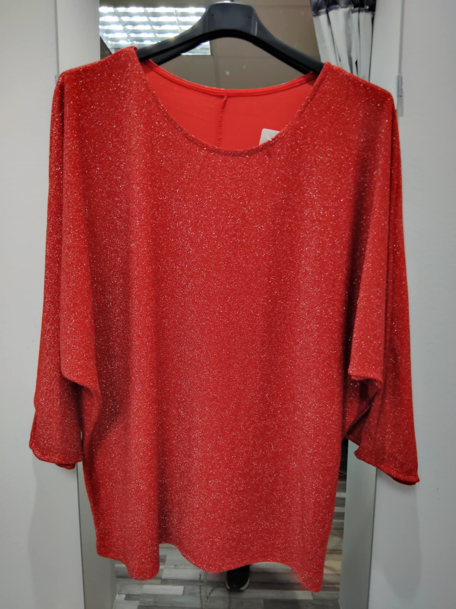 Különleges, alkalmi plus size felső, amely elegánsan csillog a bevarrt lurexszálaknak köszönhetően. A denevér ujjú szabás és a kerek nyak kényelmes, mégis nőies megjelenést biztosít. Extrán rugalmas anyaga szépen követi az alakot, így ideális választás minden alkatra – különösen alkalmakra, ünnepi eseményekre vagy elegáns estére.