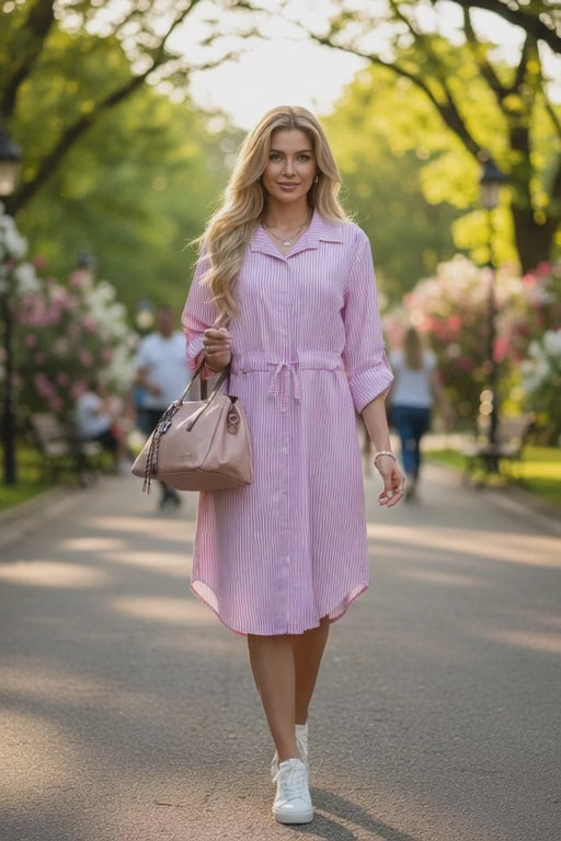 Ez a csinos, csíkos ingruha a tavaszi-nyári szezon alapdarabja, amely a klasszikus eleganciát ötvözi a modern, kényelmes viselettel. A finom függőleges csíkozás nyújtja az alakot, míg a derékban található megkötő lehetővé teszi a sziluett egyéni formálását.