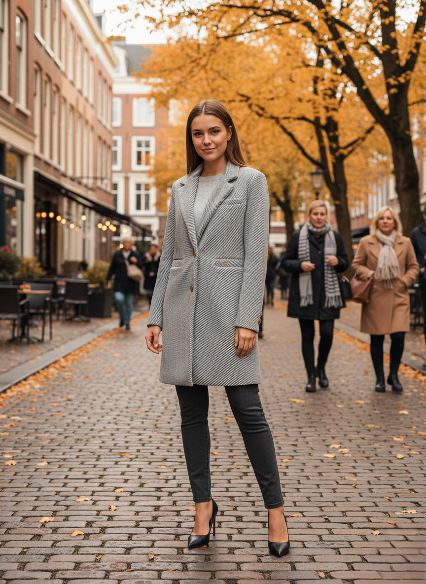Elegáns, mégis időtálló darab, amely minden igényes nő gardróbjának alapja. A klasszikus fazon és a szürke, ferde csíkozott minta modern, nőies megjelenést kölcsönöz, amivel könnyen kombinálható hétköznapi és alkalmi összeállításokkal is.