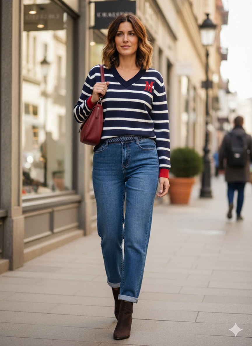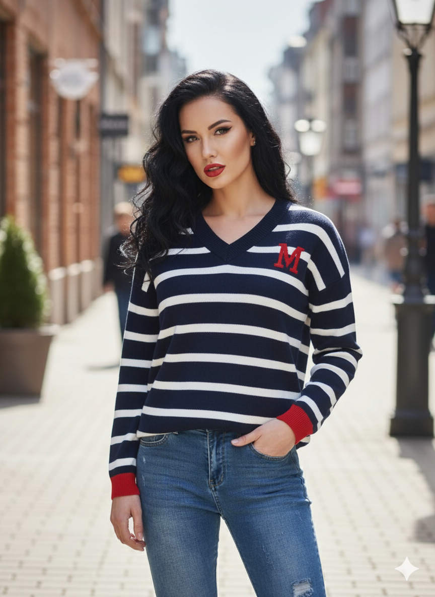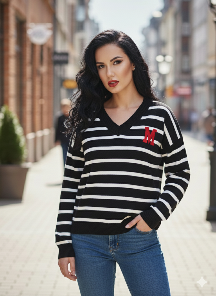 Stílusos és kényelmes viselet a hétköznapokra! Ez a könnyed kötött pulóver modern csíkos mintájával és nőies V nyakú fazonjával minden gardrób alapdarabja lehet. A passzés ujjmegoldás kényelmes illeszkedést biztosít, míg az egyméretes szabás S–XL méretig előnyösen hordható.