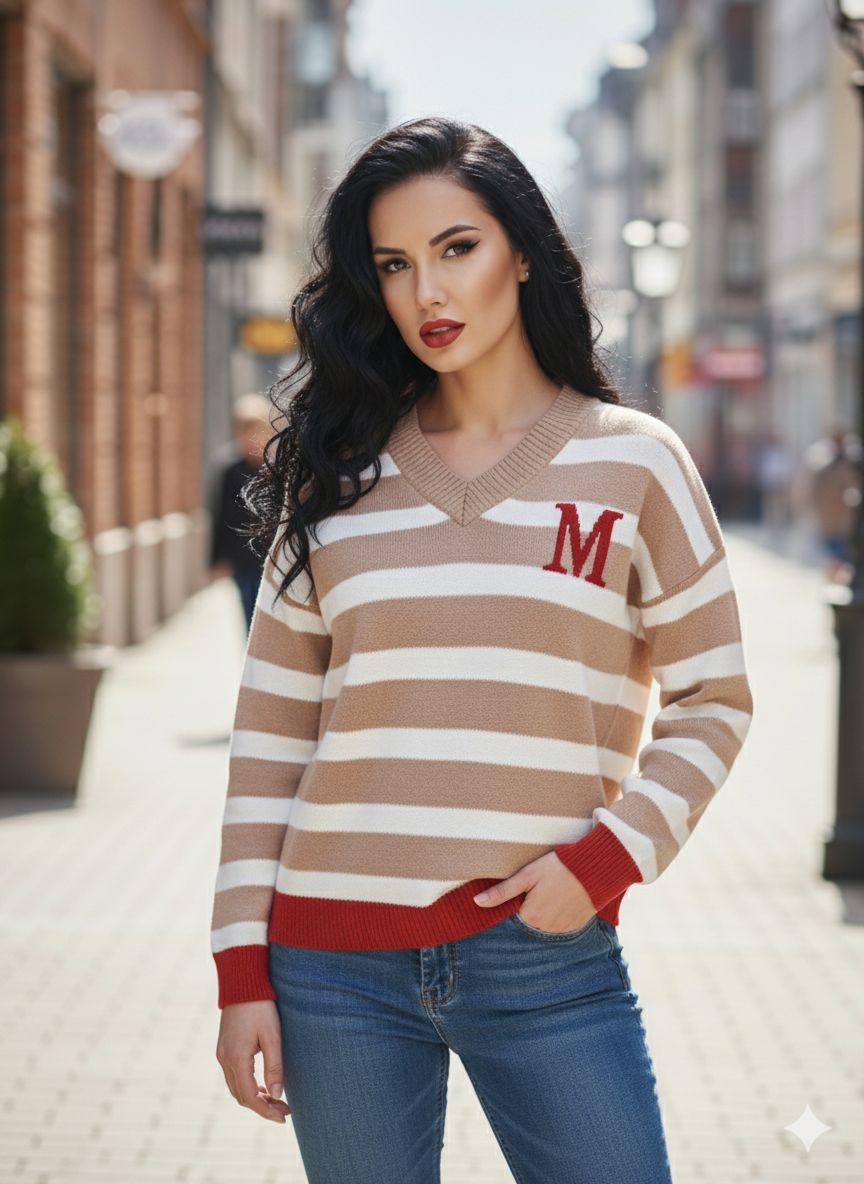 Vékony kötött női pulóver – csíkos, V nyakú, passzés ujj