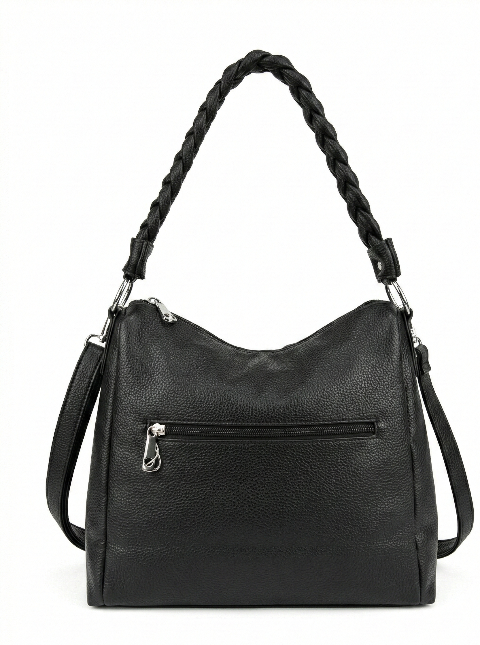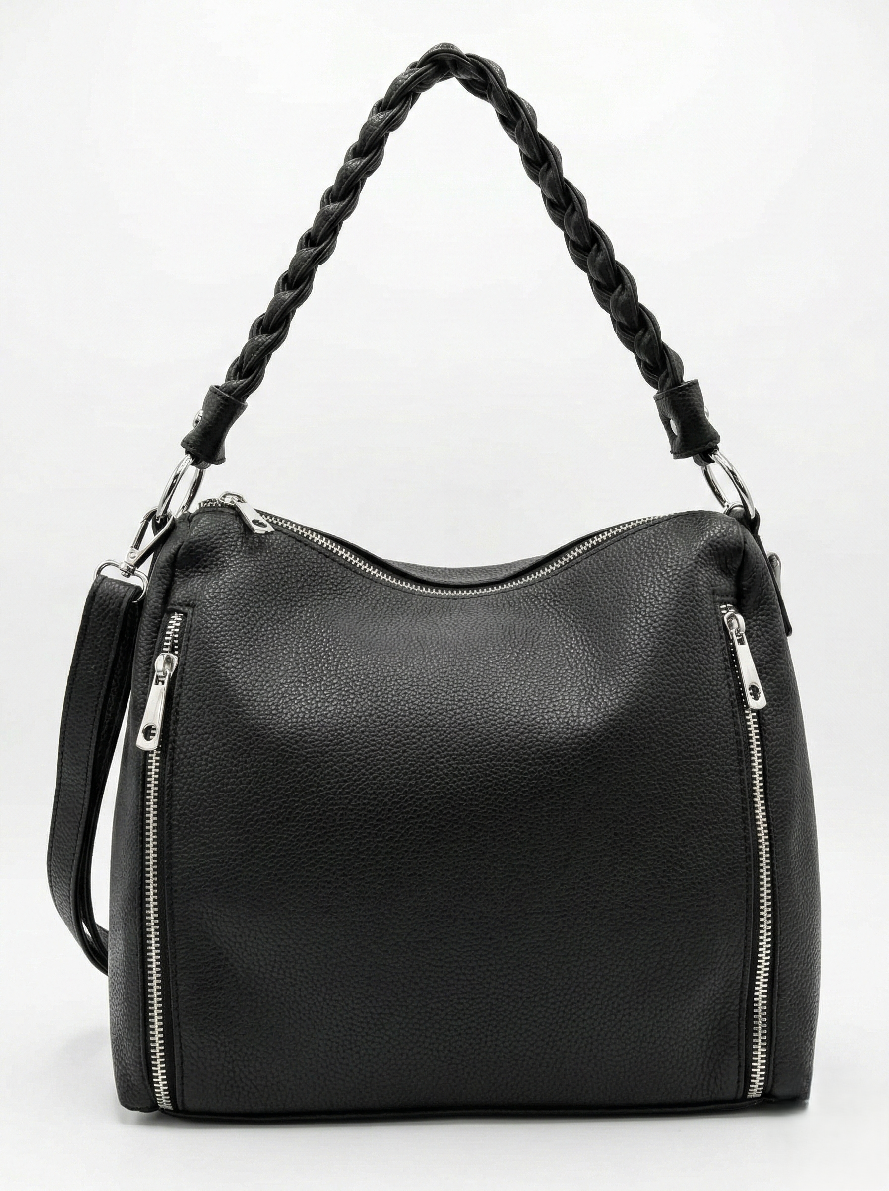 Stílusos és praktikus női váll/oldaltáska elegáns fekete színben, ezüst színű elemekkel díszítve. A fonott vállpánt különleges megjelenést ad, míg az állítható oldalpánt kényelmes viseletet biztosít a mindennapok során.
