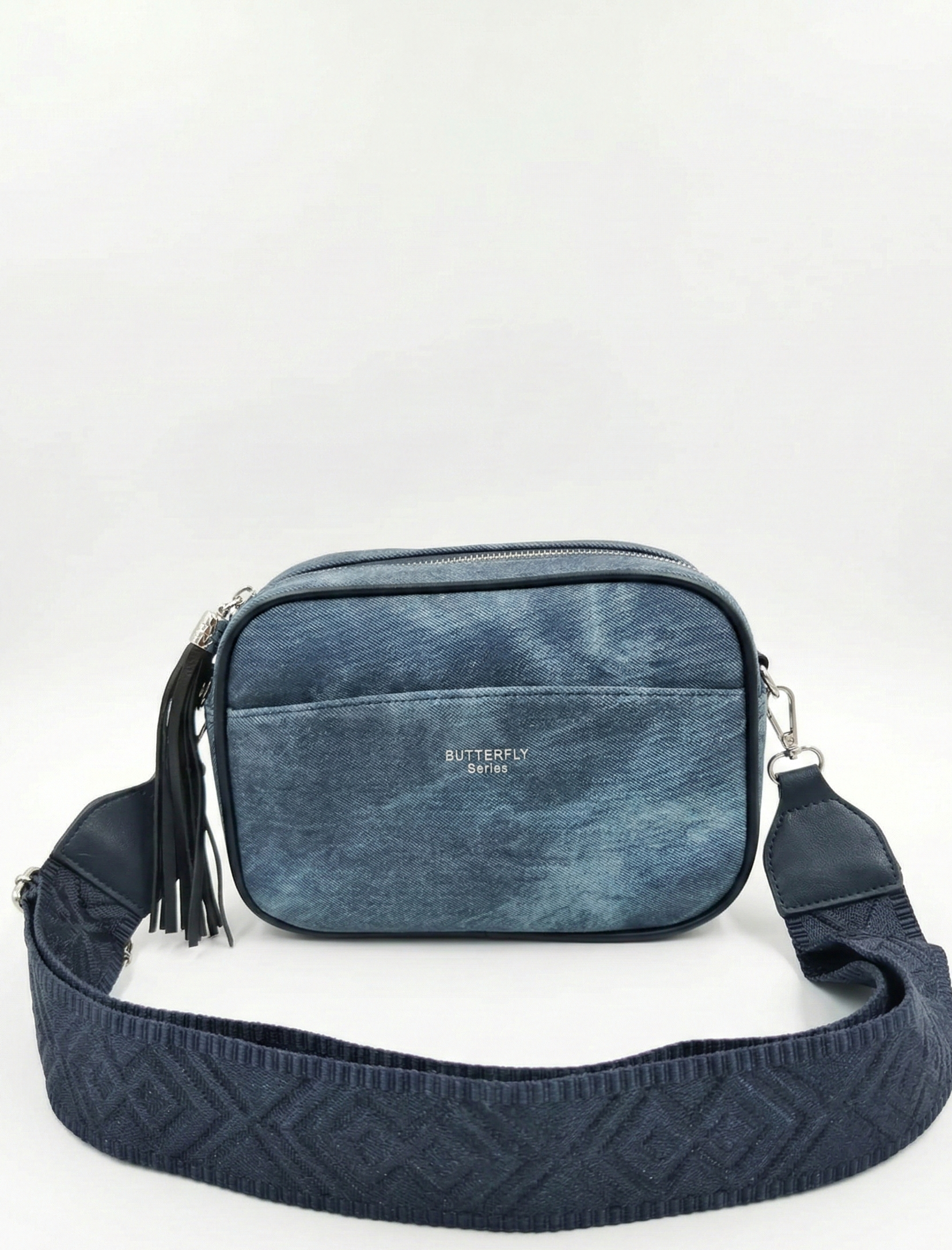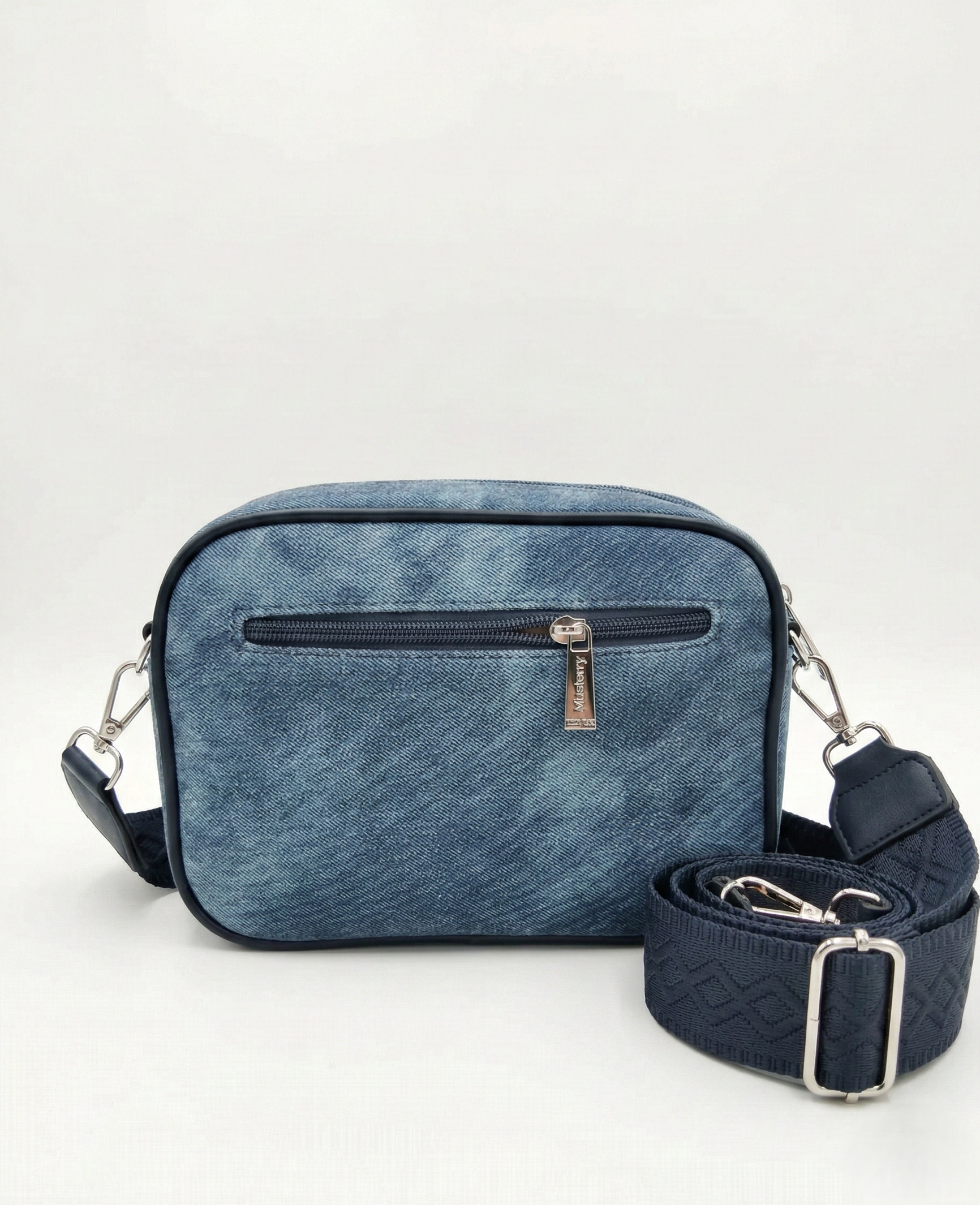 Kisméretű farmer oldaltáska – batikolt farmerkék, mintás pánttal