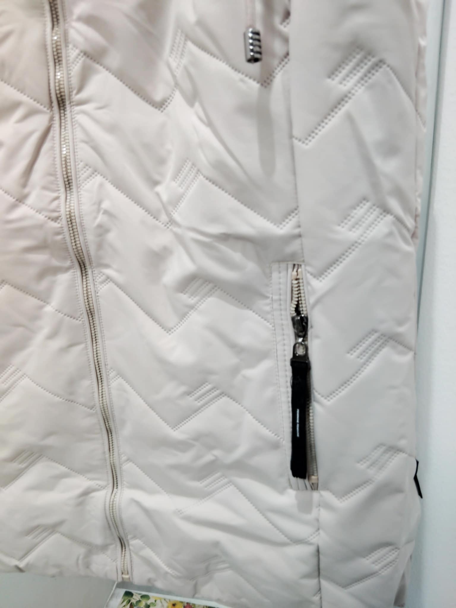 Ez a modern, kapucnis női mellény tökéletes választás átmeneti időszakra vagy réteges öltözködéshez. Könnyű, mégis meleg steppelt anyaga kényelmes viseletet biztosít, míg a cipzáras zsebek praktikus tárolást nyújtanak. A letisztult bézs szín elegánsan kombinálható minden darabbal a ruhatárban.