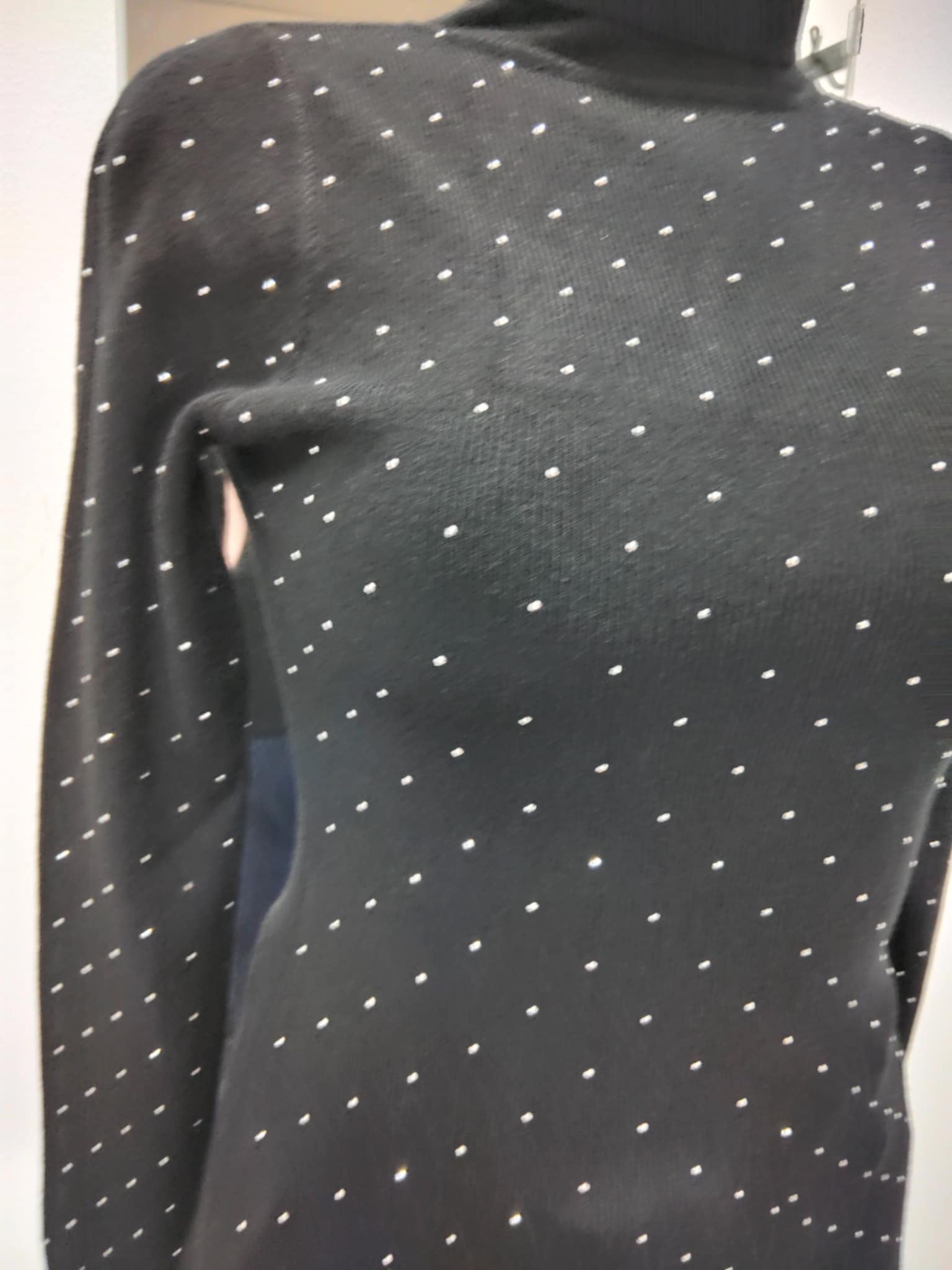 Elegáns, finoman csillogó garbó, amely tökéletes választás az őszi–téli szezonra. A puha, rugalmas anyag kellemesen simul a testhez, a diszkrét strasszkő díszítés pedig nőies, kifinomult megjelenést kölcsönöz. Magasított nyakmegoldása és hosszú ujja ideális hűvösebb napokra is.